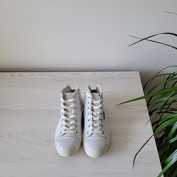Верх шкіряний Серединка та устілка текстильні Підошва гнучка, прогумована Фіксуються на замочок та шнурки для кращого відрегулювання підйому Колір молочний