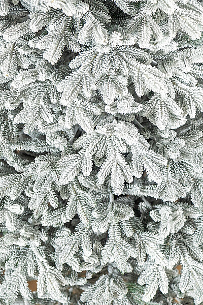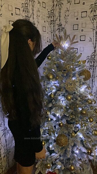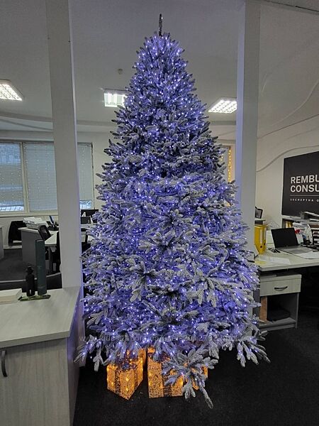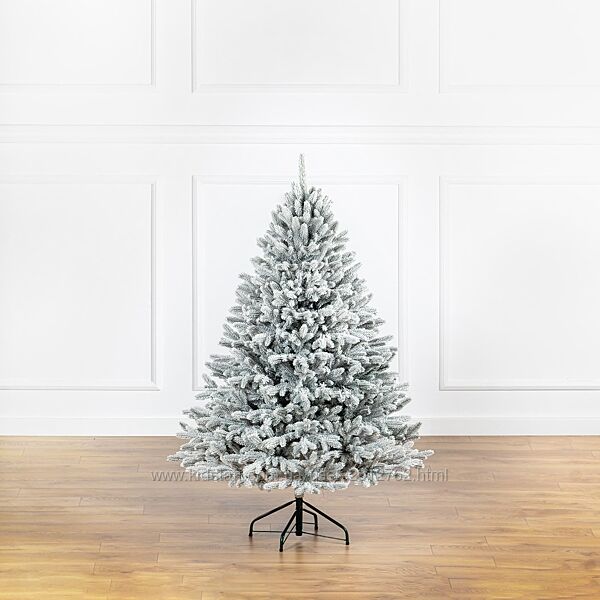Пишна та красива ялинка з великою кількістю дрібних гілочок у сніговому покритті, створює казкову святкову атмосферу та максимально реалістичний вигляд.