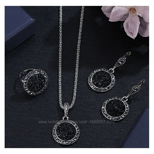 Розкішний комплект прикрас, що складається з сережок, кільця, ланцюжка та кулона, підкреслить вашу індивідуальність та додасть вишуканості будь-якому вбранню. Чорне каміння в обрамленні ювелірного сплаву створює ефектний контраст, роблячи набір стильним та універсальним.