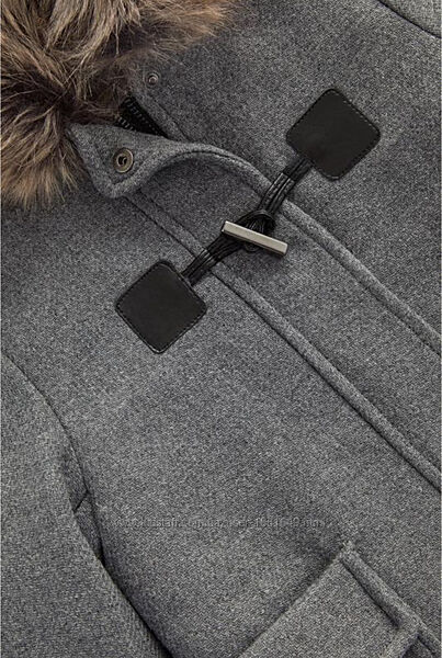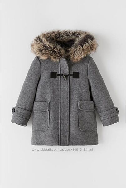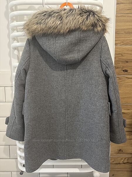 Дитяче зимове пальто Zara з напів вовни ( 50% вовна, 28% поліестер 15% акрил,7% фібра). З капюшоном, на підкладці ( 100% ацетат) утеплене тонким синтепоном ( поліестер 100%). Застібається на блискавку і додатково на кнопки, також на груди декоративний ґудзик. На ріст до 140 см. На вік 9-10 років.Заміри: