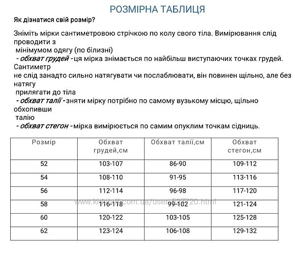 Розмір подвійний 52/54, 56/58, 60/62, щоб уникнути неправильно підібраного розміру дивіться та орієнтуйтесь на виміри. Всі виміри вказані поверху виробу, допускається похибка у вимірах +/-1-2см