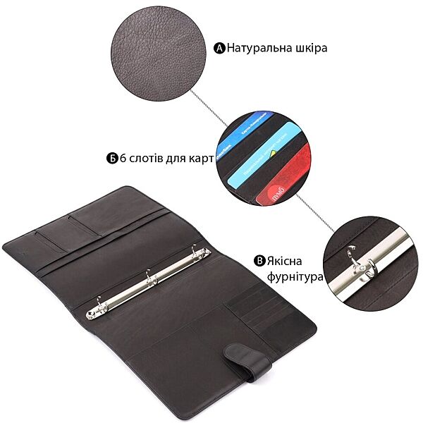 Органайзер із натуральної шкіри чорного кольору. Закривається хлястиком на кнопку – надійно та зручно. Усередині передбачено вісім осередків для карт, три прилеглі кишені та металевий тримач для файлів формату А4. На лицьовій стороні в правому нижньому кутку розташований фірмовий металевий логотип бренду, що підкреслює стиль і автентичність виробу.