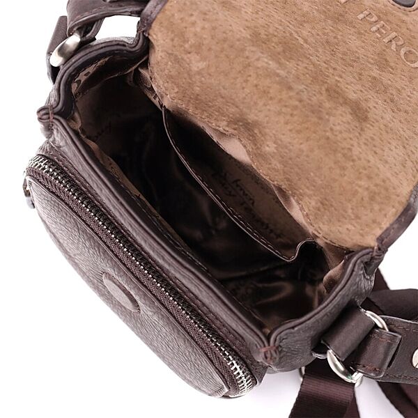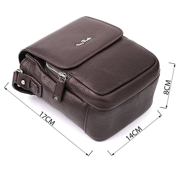 Сумка виготовлена з натуральної зернистої шкіри коричневого кольору. На лицьовій стороні розташований металевий логотип бренду, що підкреслює оригінальність та елегантність. Основне відділення закривається клапаном на магніт. Усередині передбачена відкрита кишеня, доповнена накладною кишенею на блискавці. На тильній стороні розташована вертикальна кишеня на блискавці. Сумка забезпечена брелком із двома металевими кільцями та незнімним брендованим текстильним ременем. Фурнітура виконана під срібло, що надає виробу сучасного та стриманого характеру.