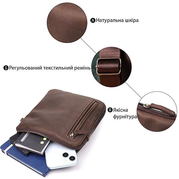 Подробное описание: Практична сумка для чоловіків на плече з натуральної вінтажної шкіри 723149 Коричневий