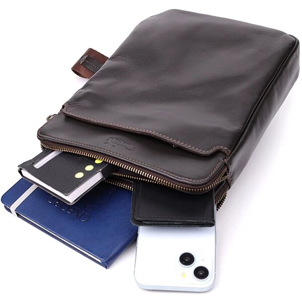 Продумана організація внутрішнього простору дозволяє зручно розмістити документи, планшет чи особисті речі. Зовнішні кишені забезпечують швидкий доступ до необхідних предметів, а міцний ремінь з шкіряними вставками гарантує комфорт при носінні.