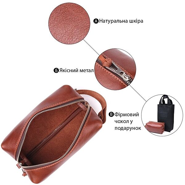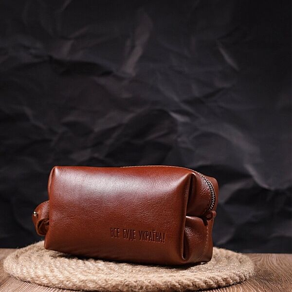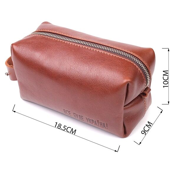 Місткий чоловічий несесер, середнього розміру в гарній гладкій шкірі, з патріотичним тисненням на лицьовій стороні “Все буде Україна”. Має просторе відділення, в яке помістяться всі необхідні речі. Надійна фурнітура представлена у срібному кольорі. Для зручного перенесення аксесуарів є спеціальна ручка на бічній стінці. Запакована ця косметичка в красиву сумку фетрову. Вироби зі шкіри – чудова ідея подарунка на будь-які свята. ОПЛАТА та ДОСТАВКА: накладний платіж (передоплата 200 грн, залишок при отриманні посилки) або повна оплата на картку. Терміни відправлення 1-3 робочих днів.