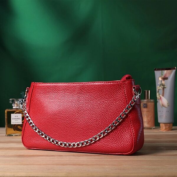 Подробное описание: Яскрава сумка багет з ланцюжком і знімним ремінцем з натуральної шкіри 722836 Червона