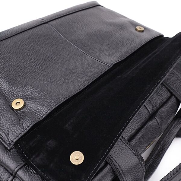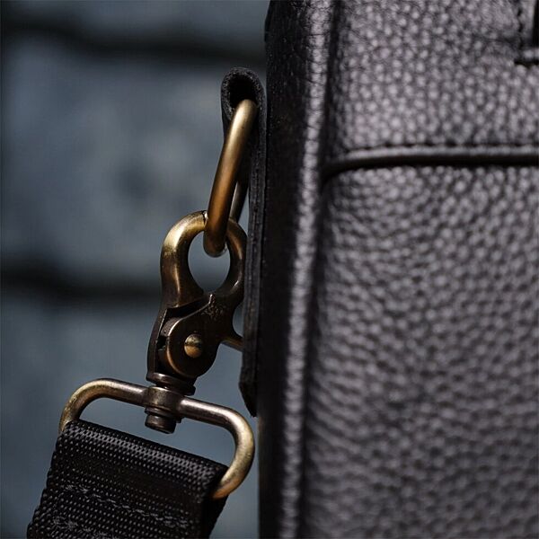 Фурнітура у відтінку "під латунь" надає моделі благородного акценту і підкреслює діловий характер. Для перенесення передбачені дві міцні шкіряні ручки, а також знімний регульований текстильний ремінець, який можна носити на плечі або через плече.