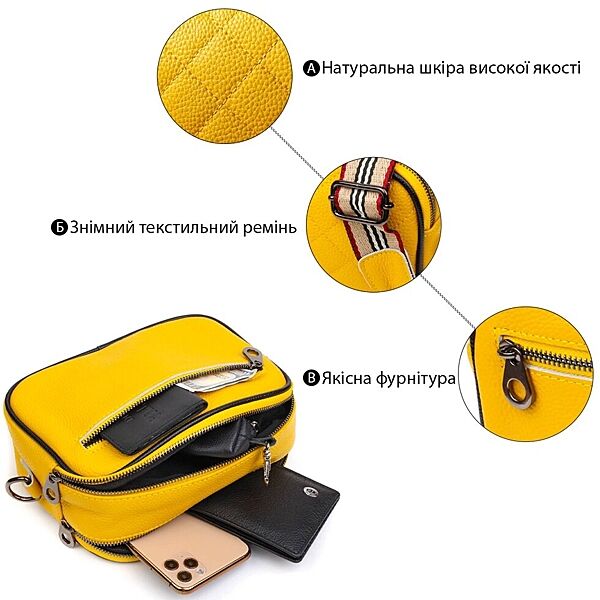 Подробное описание: Прямокутна жіноча сумка крос-боді з натуральної шкіри 722114 Жовта