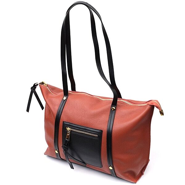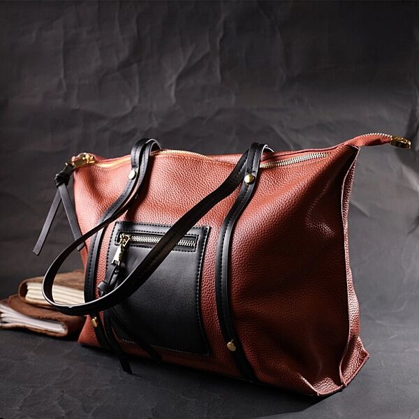 Жіноча містка сумка, у поєднанні двох кольорів коричневого та чорного. Пошито виріб з натуральної шкіри флотар, яка невибаглива у догляді та довго носиться. Аксесуар складається з двох відділень та трьох кишень на блискавках різної величини. Носити сумку можна на плечі та в руках, для цього є подовжені шкіряні ручки. В аксесуарі використано якісну фурнітуру кольору жовтого золота. ОПЛАТА та ДОСТАВКА: накладний платіж (передоплата 200 грн, залишок при отриманні посилки) або повна оплата на картку. Терміни відправлення 1-3 робочих днів.