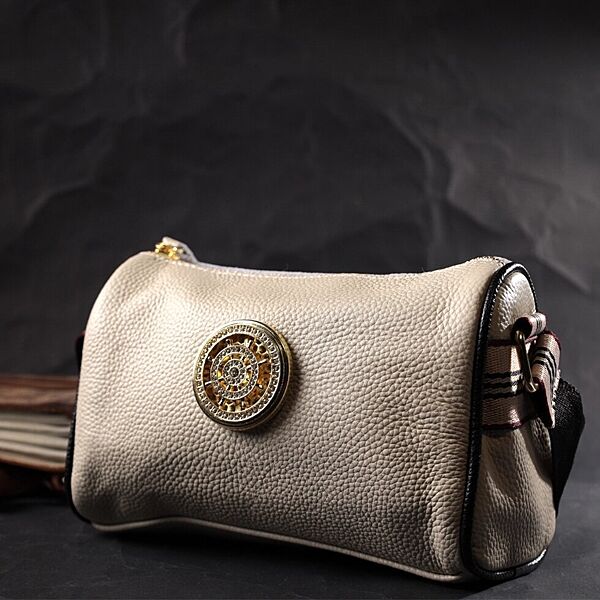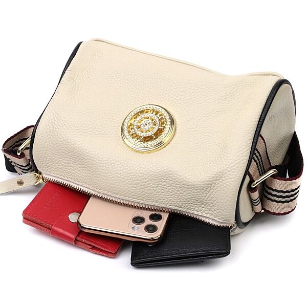 Жіноча цікава сумка у білому з молочним відтінком кольорі з натуральної шкіри з високим показником якості та зносостійкості. На лицьовій стороні розташована кругла прикраса з камінчиками, що надає сумці стильного та вишуканого вигляду. Аксесуар складається з одного основного відділення, потайної кишені на блискавці, кишені відкритого типу та кишені на блискавці зовні. Носити сумку можна на плечі і через плече, для цього є текстильний ремінь, що не знімається. У виробі використано якісну фурнітуру кольору жовтого золота. Універсальний варіант сумки як на вечір так і як сумочка на кожен день. ОПЛАТА та ДОСТАВКА: накладний платіж (передоплата 200 грн, залишок при отриманні посилки) або повна оплата на картку. Терміни відправлення 1-3 робочих днів.