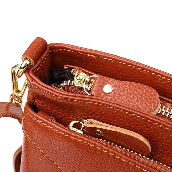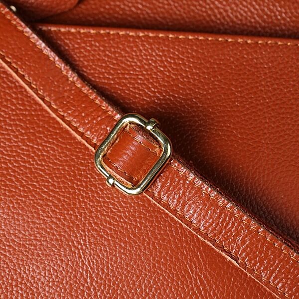 Фурнітура у кольорі жовтого золота гармонійно доповнює теплий відтінок коричневої шкіри, надаючи сумці вишуканий та стильний вигляд.