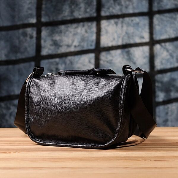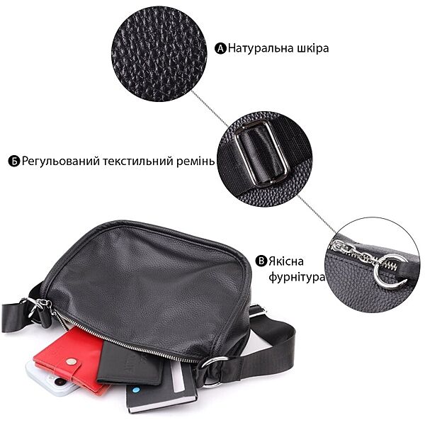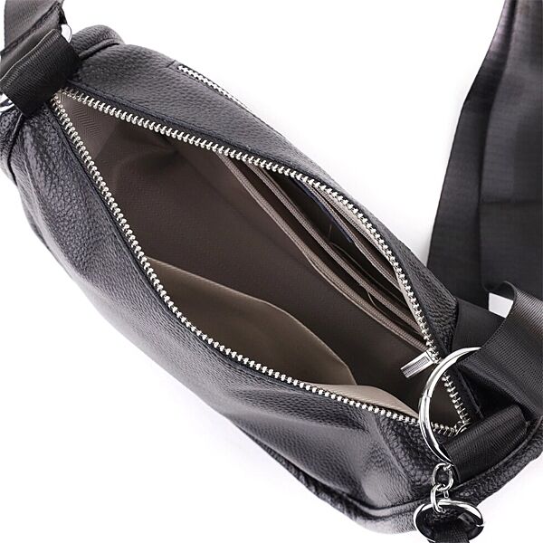 Жіноча шкіряна сумка e у чорному кольорі виконана з якісної зернистої шкіри та має напівкруглу акуратну форму, що підкреслює елегантність та сучасний стиль. Особливий акцент моделі - декоративний бігунок у вигляді стильного брелка, який додає індивідуальності та вишуканості. Сумка закривається на блискавку, всередині одне основне відділення з двома кишенями на блискавці та двома відкритими кишенями для дрібниць, на тильній стороні розташована зовнішня кишеня на блискавці. Текстильний ремінь не знімний та забезпечує зручне носіння, а фурнітура під срібло гармонійно доповнює загальний образ. Ця сумка стане універсальним аксесуаром для повсякденного використання та особливих випадків, поєднуючи практичність, стиль та увагу до деталей. ОПЛАТА та ДОСТАВКА: накладний платіж (передоплата 200 грн, залишок при отриманні посилки) або повна оплата на картку. Терміни відправлення 1-3 робочих днів.