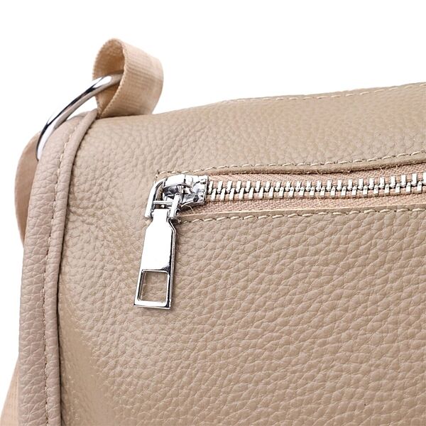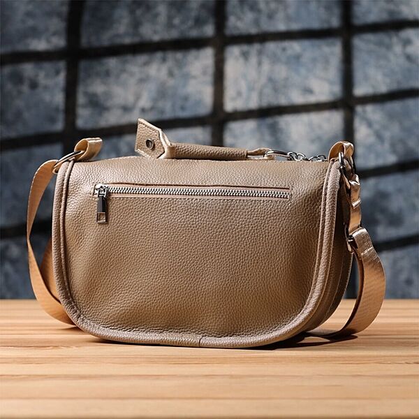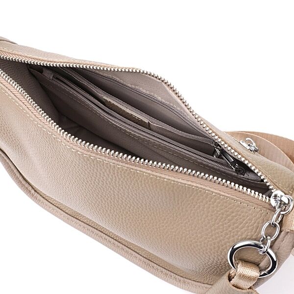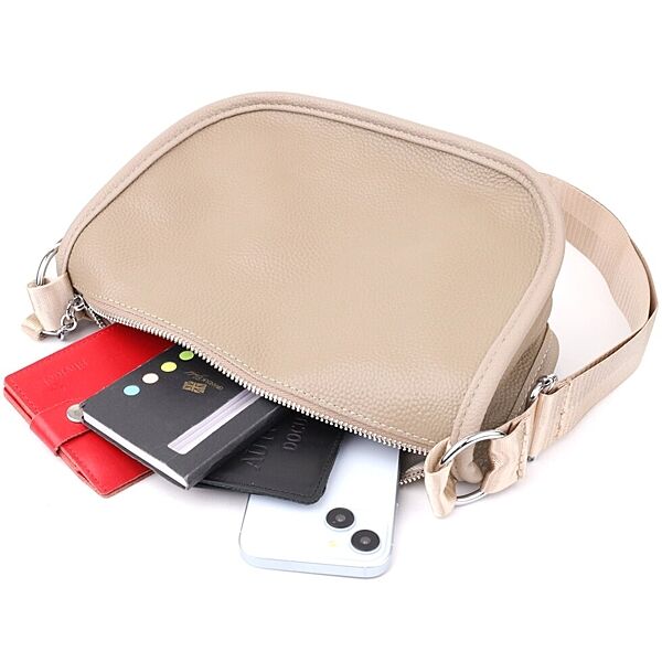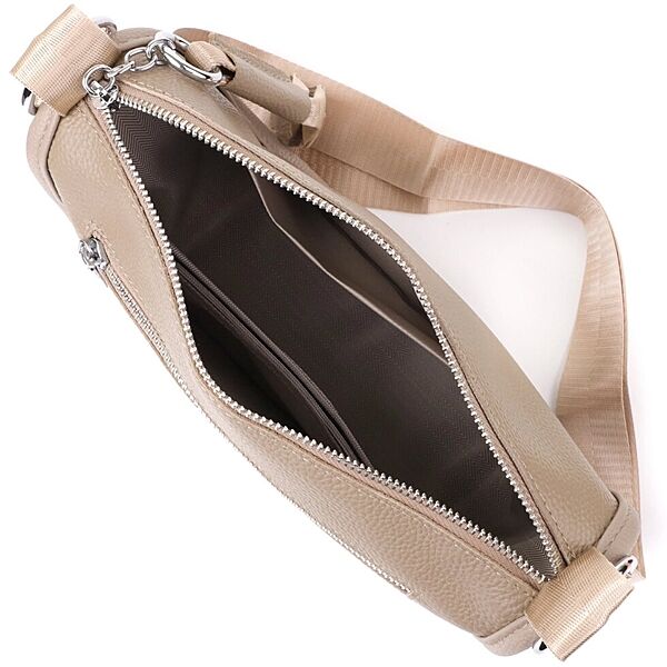 Жіноча шкіряна сумка у бежевому кольорі виконана з якісної зернистої шкіри та має напівкруглу акуратну форму, яка підкреслює витонченість та сучасний стиль. Особливу увагу привертає декоративний бігунок у вигляді елегантного брелка, що надає моделі індивідуальності та шарму. Сумка закривається на блискавку, всередині розташоване основне відділення із двома кишенями на блискавці та двома відкритими кишенями для дрібних предметів, а на тильній стороні є зовнішня кишеня на блискавці. Незнімний текстильний ремінь забезпечує зручність при носінні, а фурнітура під срібло гармонійно відтінює теплий бежевий колір шкіри. Ця сумка стане стильним та практичним аксесуаром як для повсякденних образів, так і для особливих випадків. ОПЛАТА та ДОСТАВКА: накладний платіж (передоплата 200 грн, залишок при отриманні посилки) або повна оплата на картку. Терміни відправлення 1-3 робочих днів.