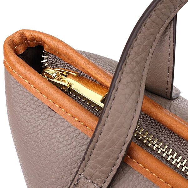 Тверде дно допомагає сумці зберігати форму та надає їй стійкості. Фурнітура кольору жовтого золота ефектно контрастує зі шляхетним сірим відтінком шкіри, додаючи аксесуару витонченості.