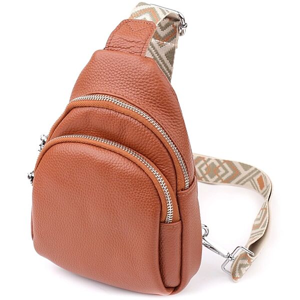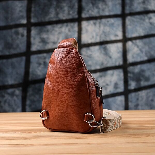 На особливу увагу заслуговує регульований текстильний ремінь з яскравим стильним візерунком - він не тільки забезпечує комфортну посадку на тілі, але і стає виразним елементом дизайну. Ремінь незнімний, але легко регулюється під ваше зростання і спосіб носіння. Фурнітура виконана в сріблястому кольорі, що надає аксесуару сучасний і стриманий блиск, який чудово поєднується з текстурою шкіри та акцентами ременя.