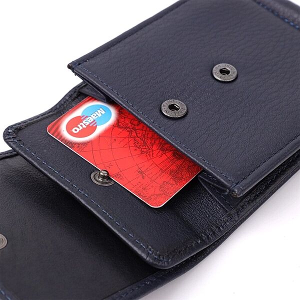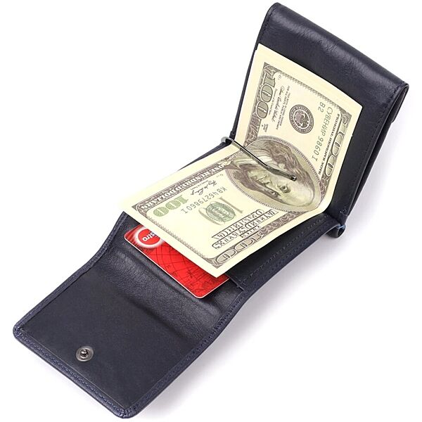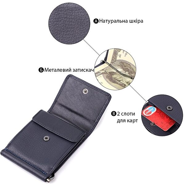 Стильний затискач для грошей із зернистої натуральної шкіри синього кольору - це поєднання мінімалізму та функціональності. Компактна форма, продумані відділення для карт та надійний металевий затискач забезпечують зручне зберігання. Контрастна прошивка та металевий логотип бренду надають аксесуару сучасного та елегантного вигляду, підкреслюючи смак та статус власника. ОПЛАТА та ДОСТАВКА: накладний платіж (передоплата 200 грн, залишок при отриманні посилки) або повна оплата на картку. Терміни відправлення 1-3 робочих днів.