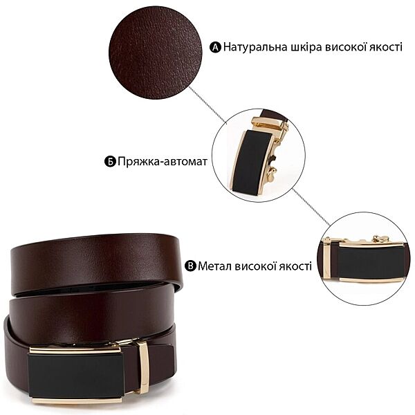 Подробное описание: Ремінь чоловічий з золотистою прямокутною пряжкою720260 Коричневий