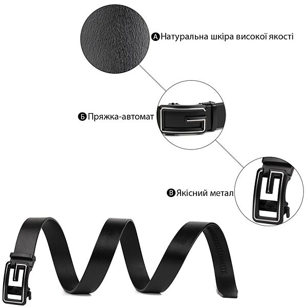 Якісний шкіряний ремінь чорного кольору з натуральної шкіри. Виріб прекрасно підійде під будь-який ваш образ. Пряжка ремінця нагадує букву G в поєднанні з затемненим металом. Автоматична пряжка дуже проста в експлуатації. Ремінь не прив´язує вас до певного взуття. За якістю аксесуар нічим не поступається дорогим брендам, але при цьому коштує значно дешевше. Впевнені, що ремінь підкорить будь-якого чоловіка. Рекомендуємо вам дану модель, якщо ви перебуваєте в пошуку якісного повсякденного ременя. ОПЛАТА та ДОСТАВКА: накладний платіж (передоплата 200 грн, залишок при отриманні посилки) або повна оплата на картку. Терміни відправлення 1-3 робочих днів.