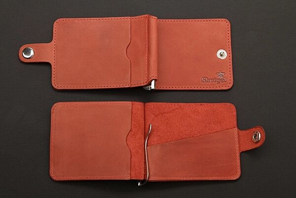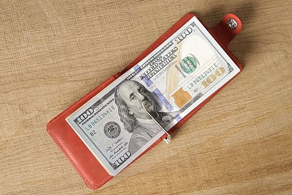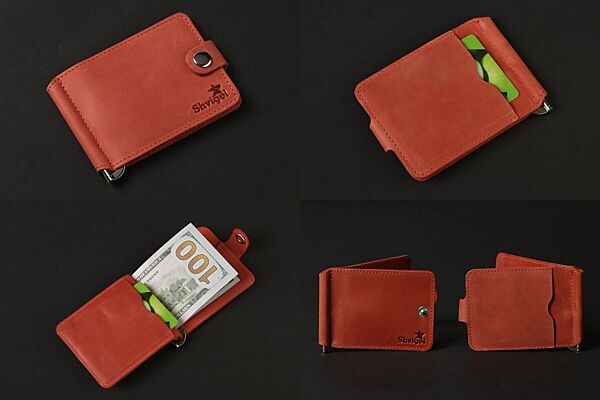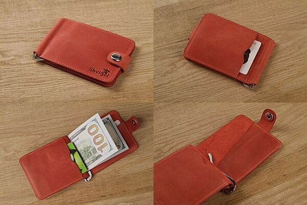 Стильний шкіряний затискач червоного кольору. Аксесуар виконаний з натуральної високоякісної вінтажної шкіри. Колір фурнітури: срібло. Виріб акуратно прошито надміцною червоною ниткою. На задній зовнішній стороні аксесуара знаходиться кишенька для пластикових карток. Затиск упакований у фірмовий текстильний пилозахисний чохол.