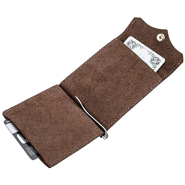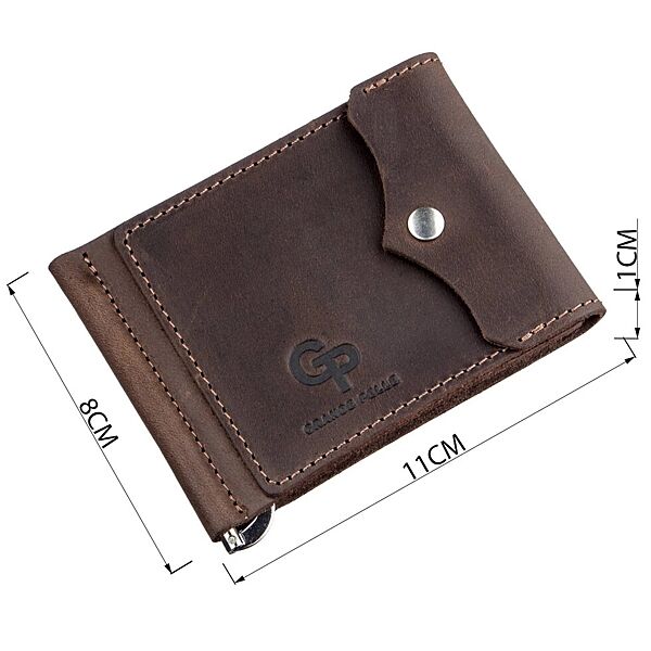 Компактний зажим з італійської натуральної шкіри найвищої якості коричневого кольору. На лицьовій стороні аксесуара є тиснений логотип бренду-виробника. Затискач стане для вас ідеальним рішенням, якщо ви не є шанувальником портмоне або клатчу. За рахунок свого невеликого розміру виріб легко поміститься в кишеню або невелику сумку. Ви також можете покласти в нього пару необхідних кредиток. Сама конструкція аксесуару виготовлена з надійного металу. Виріб стане прекрасним подарунком для близької людини. Модель упакована в повстяний чохол.