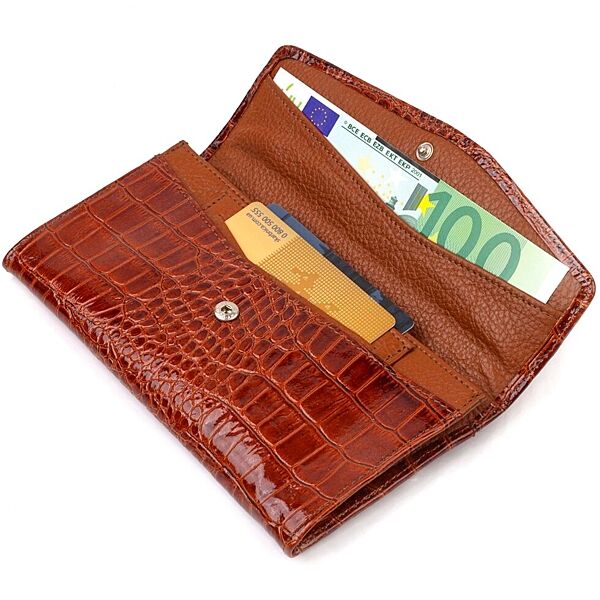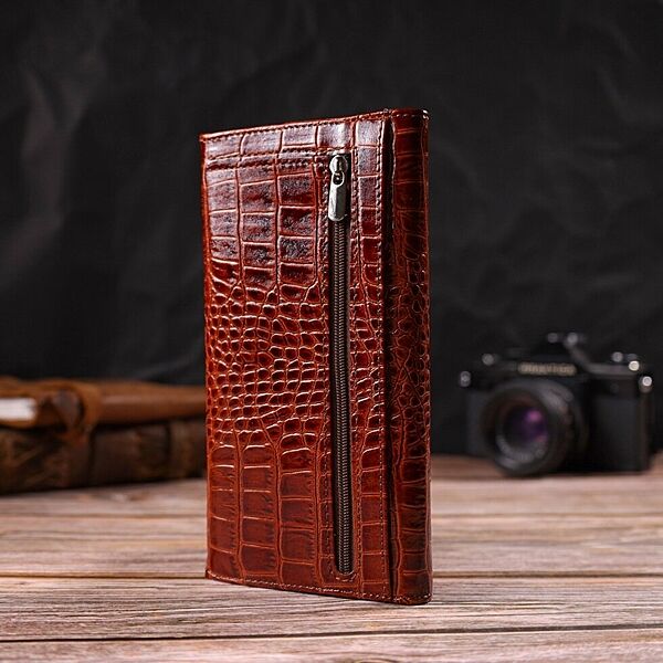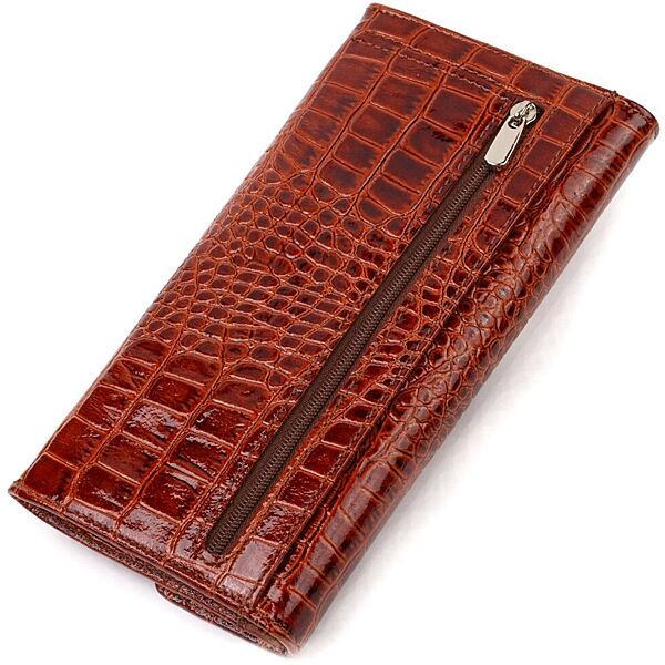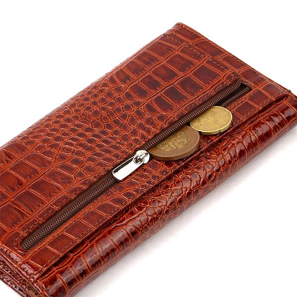Жіноче портмоне з лакованої натуральної шкіри з тисненням під крокодила 721704 Коричневе
