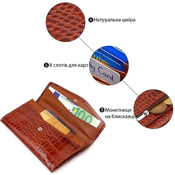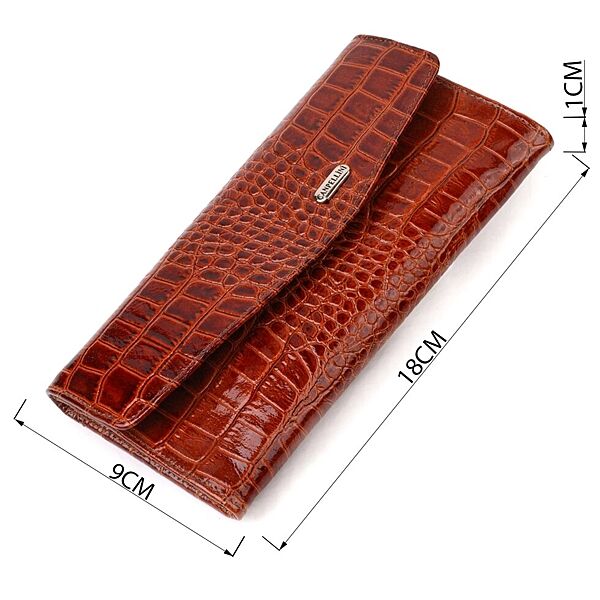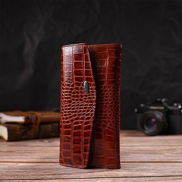 Гаманець для стильних жінок, горизонтального типу із якісної натуральної шкіри, з тисненням під крокодила. Аксесуар має одне основне відділення, шість кишень для карток, чотири прилеглі кишені та монетницю. Закривається аксесуар навпіл клапаном на кнопку. Купуючи шкіряний аксесуар цієї фірми, собі або на подарунок, будьте певні, що він прослужить Вам не один рік. ОПЛАТА та ДОСТАВКА: накладний платіж (передоплата 200 грн, залишок при отриманні посилки) або повна оплата на картку. Терміни відправлення 1-3 робочих днів.