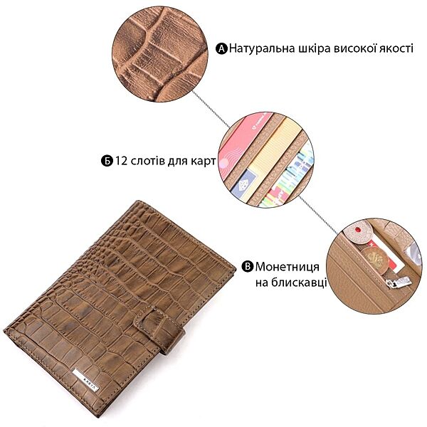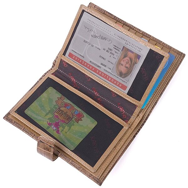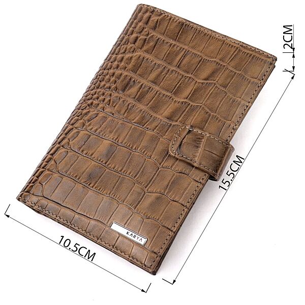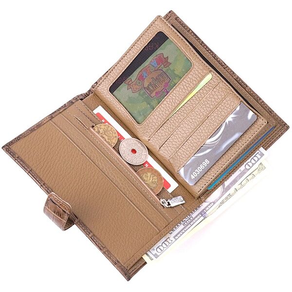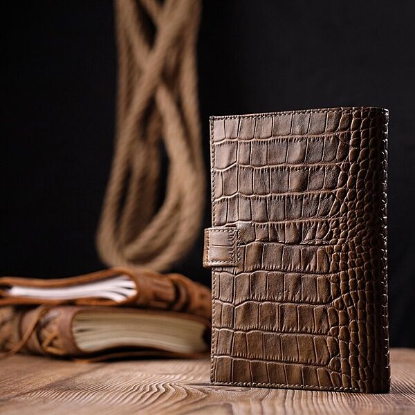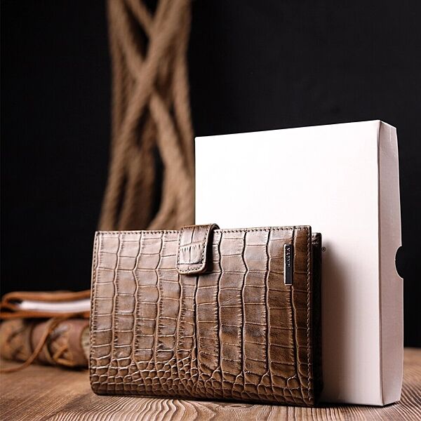 Подробное описание: Незвичайне чоловіче портмоне з хлястиком з натуральної шкіри з тисненням під крокодила 721196 Світло-коричневий