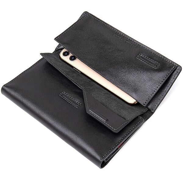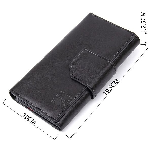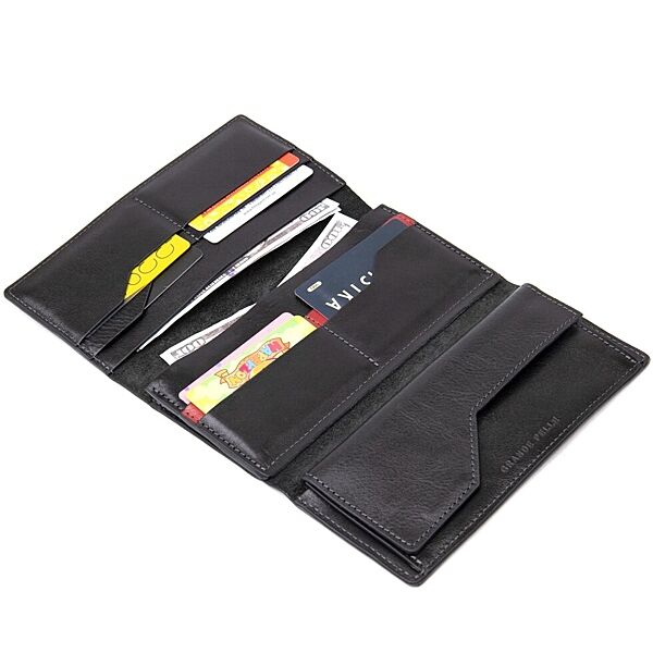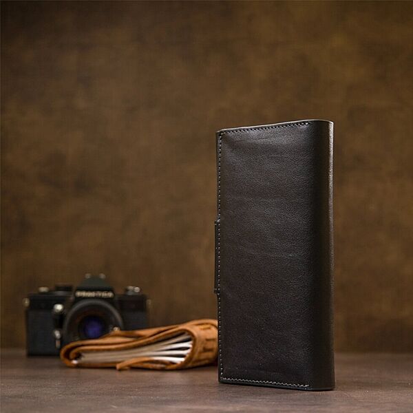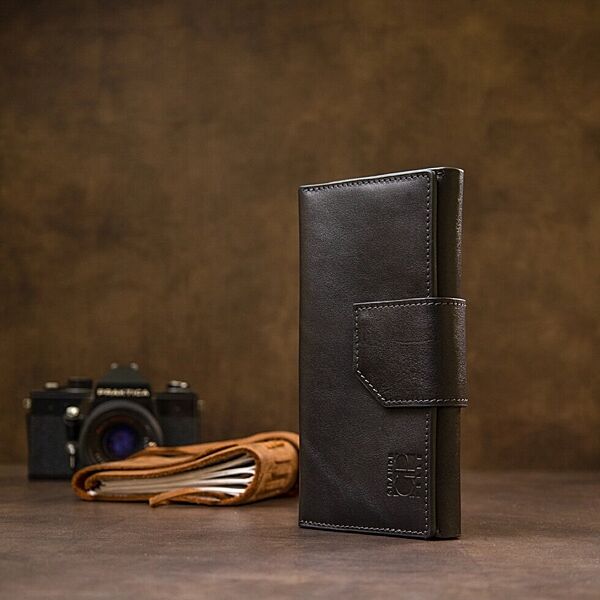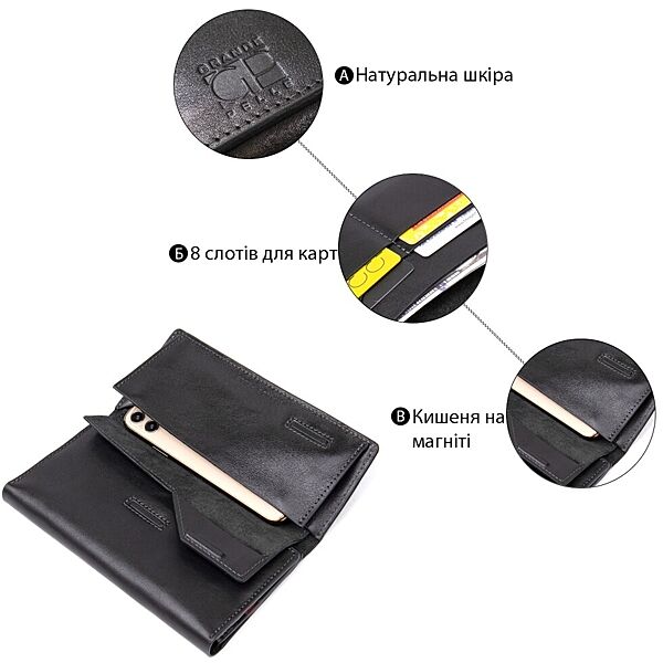 Багатофункціональний портмоне на хлястику з магнітом. Має всередині місткі і практичні відділення для купюр, велику монетницю на магніті і вісім слотів для різних карт і візиток. Матеріал виготовлення - натуральна м´яка на дотик шкіра. Колір виробу чорний, що робить гаманець практично універсальним. Упаковка - фірмова картонна коробка. ОПЛАТА та ДОСТАВКА: накладний платіж (передоплата 200 грн, залишок при отриманні посилки) або повна оплата на картку. Терміни відправлення 1-3 робочих днів.