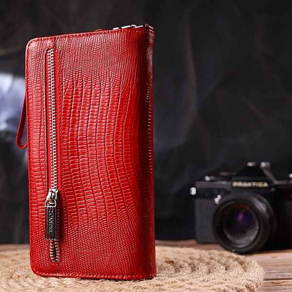 Яскравий жіночий гаманець-клатч, з натуральної фактурної шкіри, з тисненням під рептилію. Аксесуар має одне основне відділення, в яке поміщаються купюри всіх номіналів, дванадцять кишень для карток, одна з яких під сіточкою, блок для карт із зовнішнього боку, дві кишеньки на блискавці, знімний кистьовий ремінь. Закривається аксесуар на блискавку, а блок для карток закривається на кнопки. Колір фурнітури – срібло. Шкіряний гаманець є дивовижним подарунком для дружини, дівчини, подруги. ОПЛАТА та ДОСТАВКА: накладний платіж (передоплата 200 грн, залишок при отриманні посилки) або повна оплата на картку. Терміни відправлення 1-3 робочих днів.