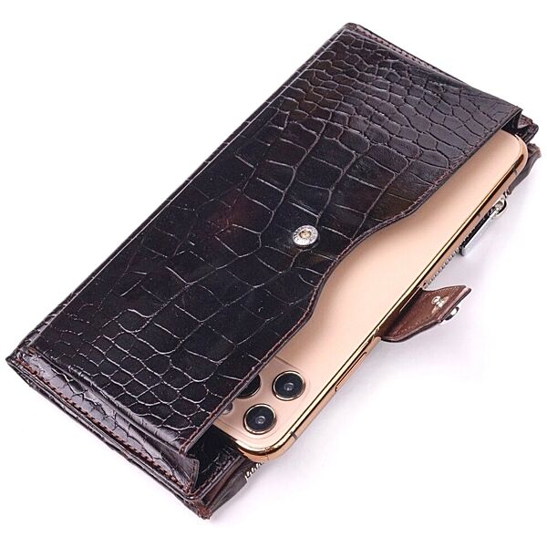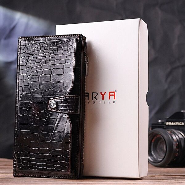 Подробное описание: Лаковане вертикальне чоловіче портмоне з натуральної шкіри з тисненням під крокодила 721424 Коричневий