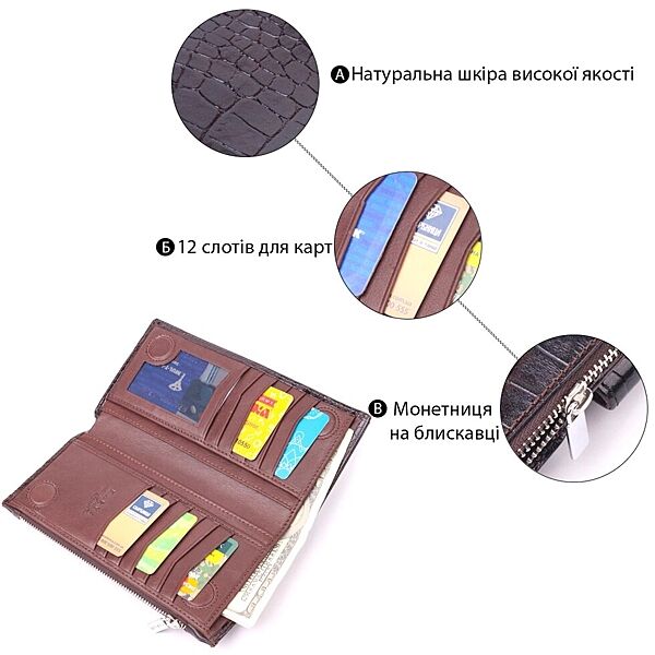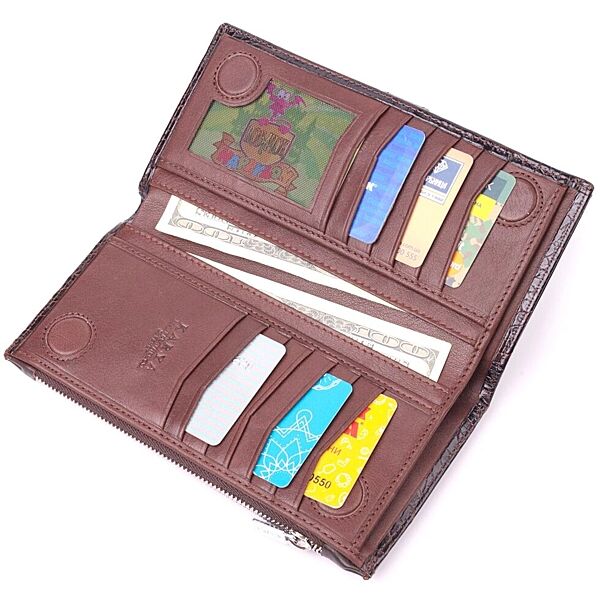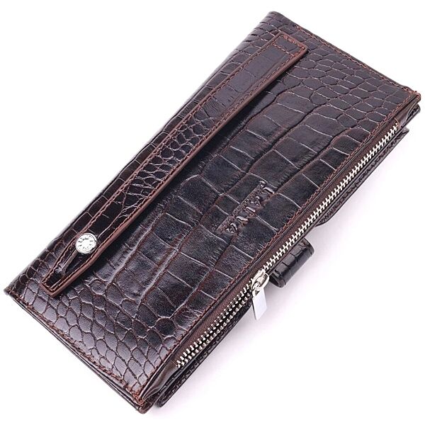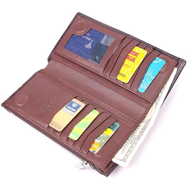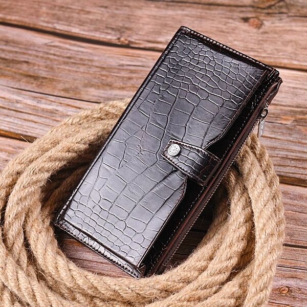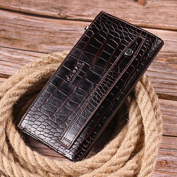 Гідний гаманець з натуральної фактурної шкіри, з тисненням під крокодила, у насиченому коричневому кольорі. Гаманець складається з одного глибокого відділення, чотирьох прилеглих кишень, дванадцяти осередків для карт, відділення під сіточкою, відділення на блискавці зовні та відділення для телефону, що закривається хлястиком на кнопку. У виробах цього елітного турецького бренду завжди використовуються найякісніші шкіряні матеріали та фурнітура. Аксесуар упакований у фірмову коробочку. Шкіряний виріб завжди буде чудовим подарунком для будь-якого чоловіка. ОПЛАТА та ДОСТАВКА: накладний платіж (передоплата 200 грн, залишок при отриманні посилки) або повна оплата на картку. Терміни відправлення 1-3 робочих днів.