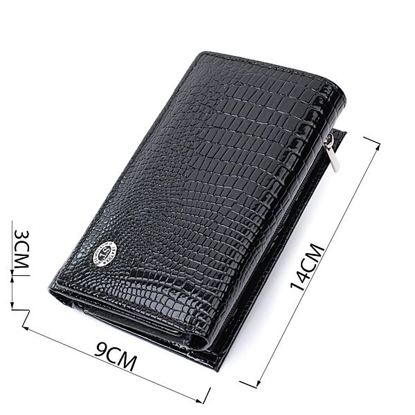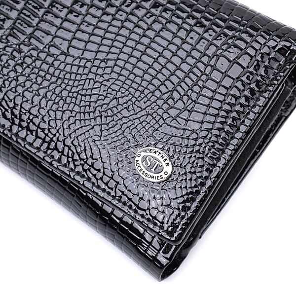 Жіночий гаманець у три складання з лакованої фактурної натуральної шкіри 722707 Чорний