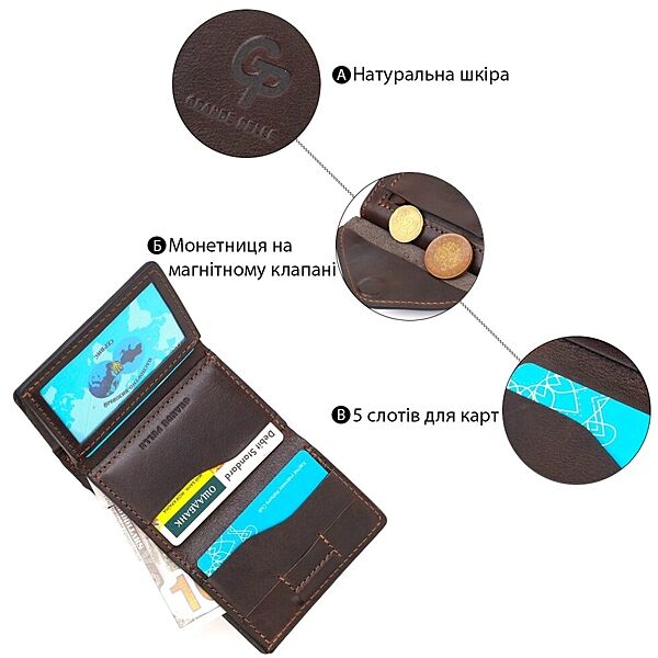 Зручне чоловіче портмоне для тих хто цінує зручність, стиль та мінімалізм. Виконано виріб із натуральної висококласної шкіри з м´якою приємною фактурою. Усередині є просторе відділення для купюр та зручні слоти для пластикових карток, також зовні є монетниця, що закривається клапаном на магніт. Закривається аксесуар у три складення на магніт. Запаковано портмоне у фірмовий чохол. ОПЛАТА та ДОСТАВКА: накладний платіж (передоплата 200 грн, залишок при отриманні посилки) або повна оплата на картку. Терміни відправлення 1-3 робочих днів.