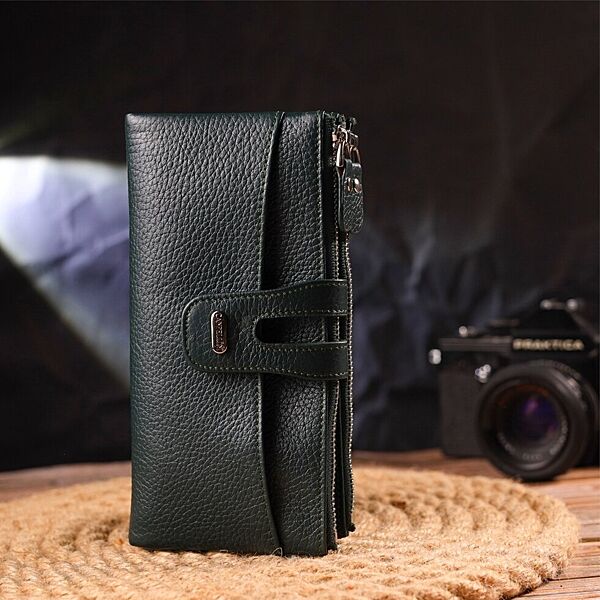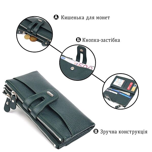 Функціональний жіночий гаманець із натуральної зернистої шкіри. Аксесуар має два широкі основні відділення, в які поміщаються купюри всіх номіналів, дві монетниці, двадцять чотири кишені для карток, дві відкриті кишені зовні та одне прозоре віконце для документів. Закривається аксесуар хлястиком на кнопку. Якщо Ви хочете порадувати себе та здивувати близьких, то неодмінно купуйте шкіряні аксесуари в нашому магазині, якість і ціна Вас однозначно порадує. ОПЛАТА та ДОСТАВКА: накладний платіж (передоплата 200 грн, залишок при отриманні посилки) або повна оплата на картку. Терміни відправлення 1-3 робочих днів.