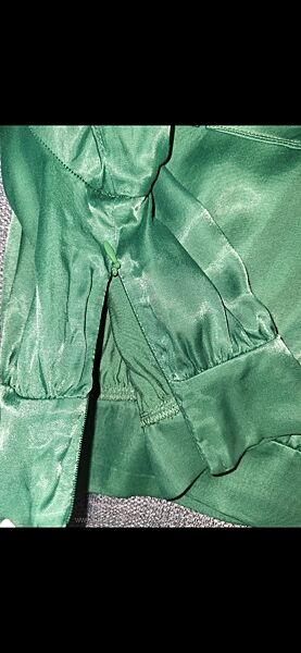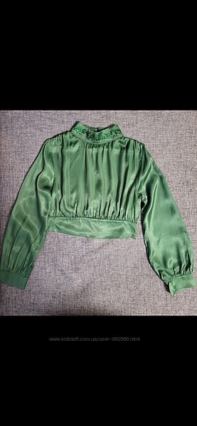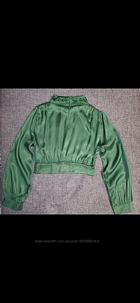 Нарядна блуза Zara, розмір S. Тканина 100 % віскоза. Заміри: ног 44 см, нот 35 см ( там де планка внизу), рукав від плеча 57 см, довжина від горловини 38 см. Збоку є змійка, стійка позаду на двох ґудзиках. Блуза нова сток, має незначні зачіпки, краще підійде на XS, або невеликі груди, мені на чашку В трохи мала. Виглядає дуже святково, чудово підійде під низ з високою посадкою. Більш якісні фото скину за потреби
