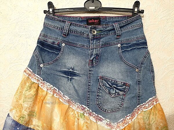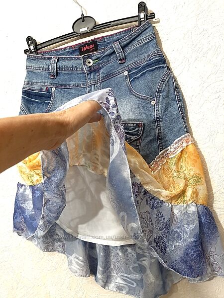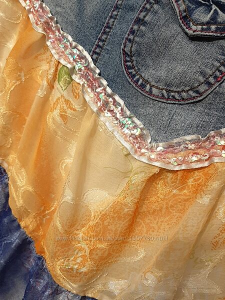 Трендова спідниця джинсова. жіноча, синя, міні/міді, різнокольорові оборки штучний шовк, на шві оборок паєтки.Маркування розміру 38, розмір 46. Підходить на розміри 44 і 46. Порівнюйте за вимірами.