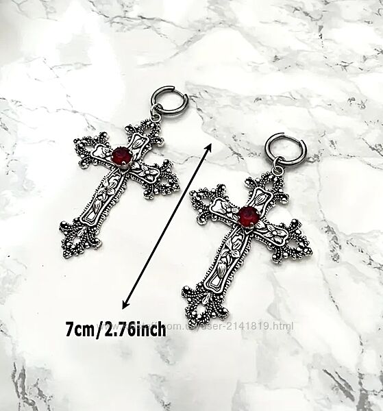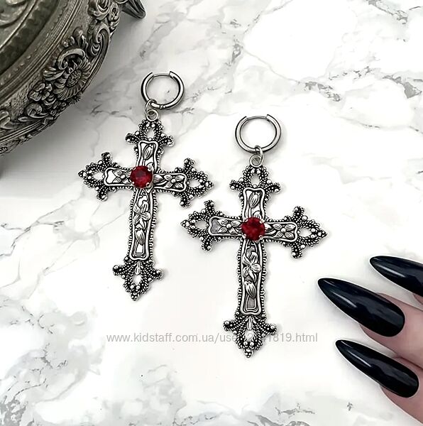 Очень эффектные стильные сережки в форме крестов в готическом стиле. Серьги серебристого цвета, инкрустированы красным кристаллом.Размер: 6 х 4 см