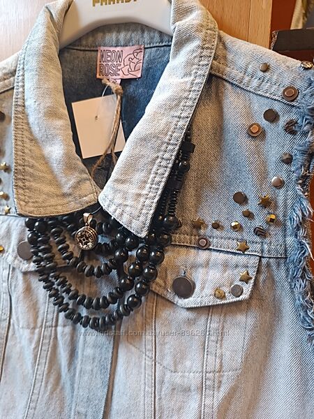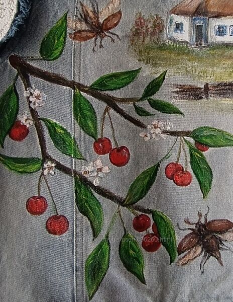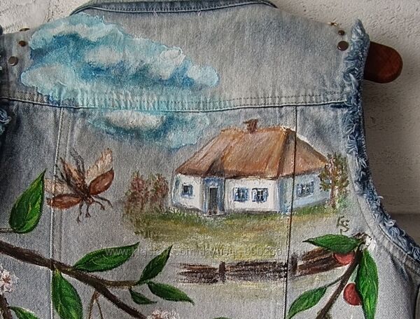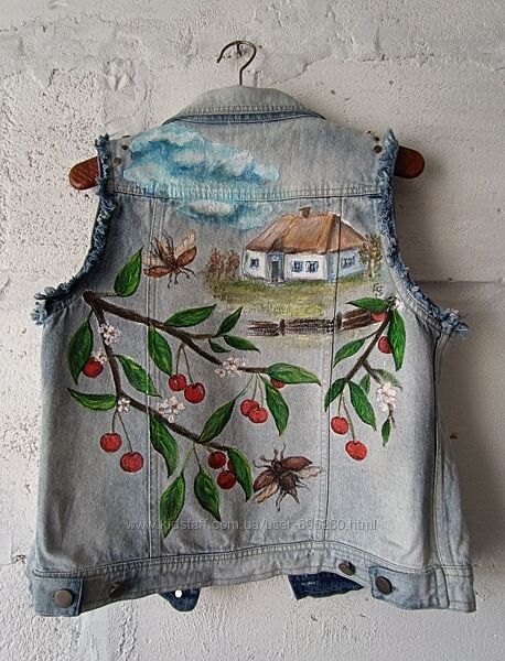 Джинсова жилетка фірми Neon Rose, з ручним авторським розписом на спині "Садок вишневий коло хати..." і прикрасами. в національному стилі.Стильний сучасний нацвональний одяг, як на повсякдень, так і на державні свята.