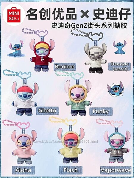 В наличии все стандартные модели + редкий + лимитированный.Продается оригинальная фигурка-брелок из официальной коллекции MINISO x Disney — серия Stitch Gen Z Street Series 2025 года.