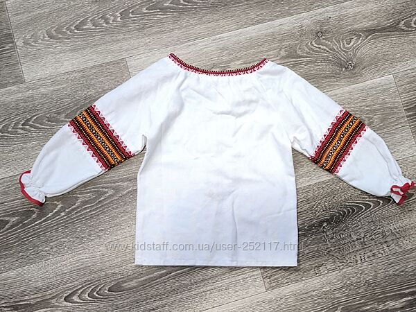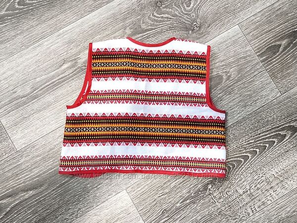 Костюм вышиванка на рост 116 см. Юбка, жилетка и сорочка. На жилетке брошь съемная. Состояние хорошее, на сорочке сзади есть 2 малозаметных пятна (последнее фото). Замеры: Юбка - длина 32,5 см, полуобхват 24,5-30 см (тянется за счет резинки). Жилетка - длина от плеча 32 см, ширина под ручками 34,5 см, не застегивается. Сорочка - длина от плеча 47,5 см, ширина 36 см, рукав от горловины 45 см, рукав от подмышки 30,5 см, горловина утягивается шнурком. Пересылаю.