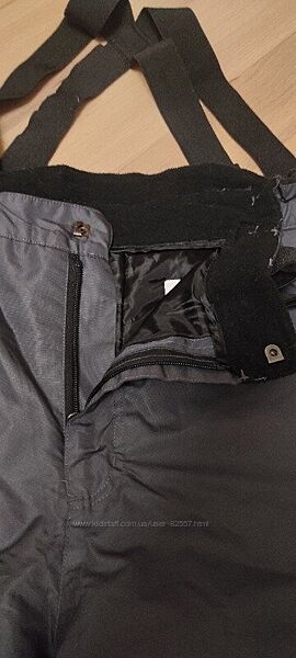 Цвет тёмно-серый. Размер 158-164 .Подтяжки регулируются ( можно отстегнуть), пояс с застёжкой-крючком, 2 передних кармана на молнии, внизу снегозащита.