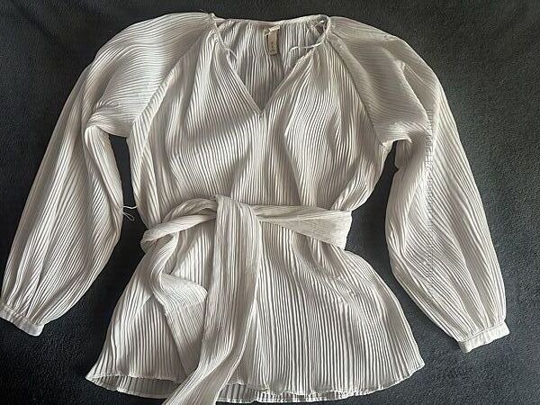 Стильна біла блуза H&M з плісированої тканини ✨Легка, ніжна й дуже жіночна 💕 Має пояс, який красиво підкреслює талію, і повітряні рукави.