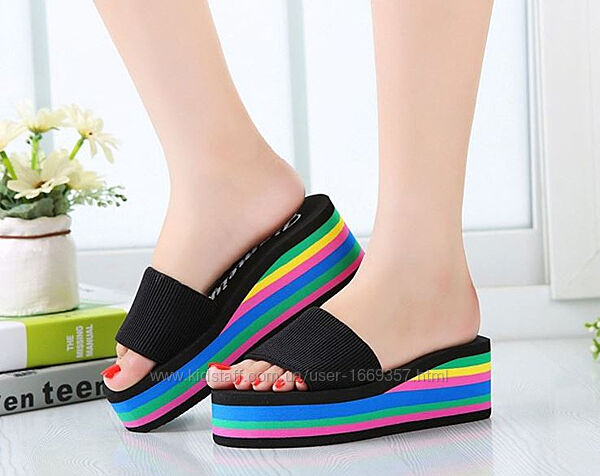 Подробное описание: Шльопанці жіночі чорні на кольоровІй танкетці Б726 Уцінка читайте опис