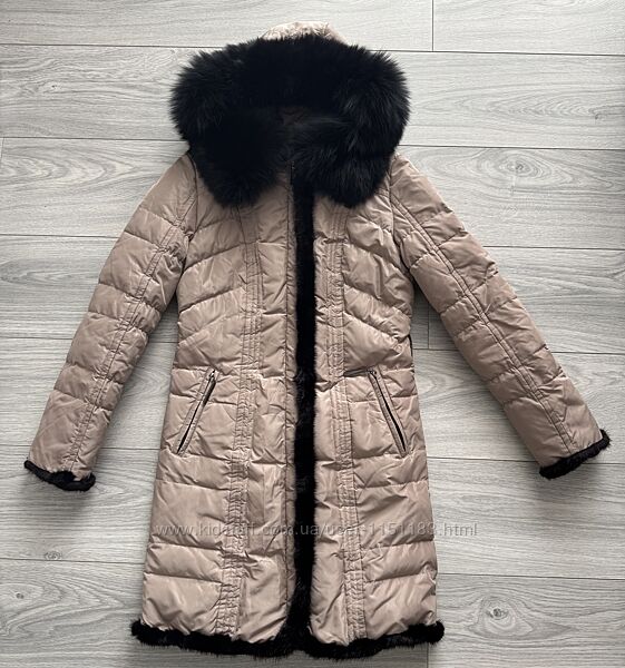 Пуховик у розмірі S, але як на мене підійде на маленьку S або XS.Колір беж, мєх - насичений чорний!