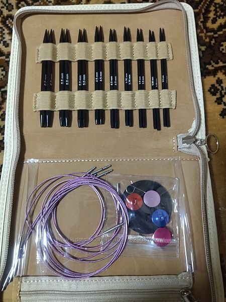 В комплекті 9 пар спиць - 3; 3.25; 3.5; 3.75; 4; 4.5; 5; 5.5; 6.