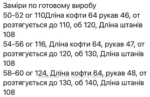 50-52 ог 110Дліна кофти 64 рукав 46, от розтягується до 110, об 120, Дліна штанів 108