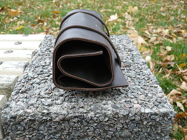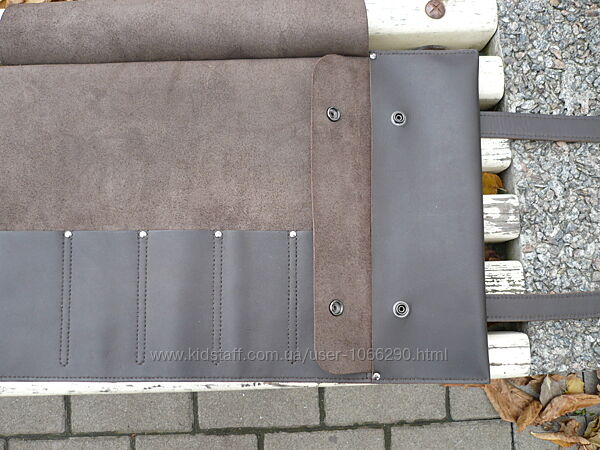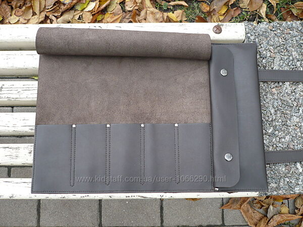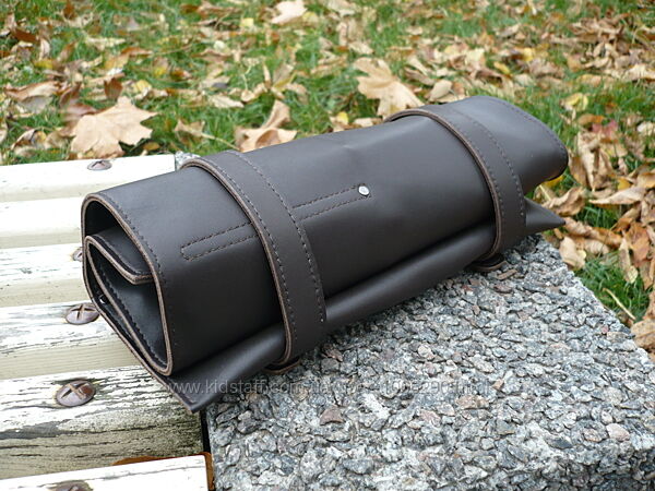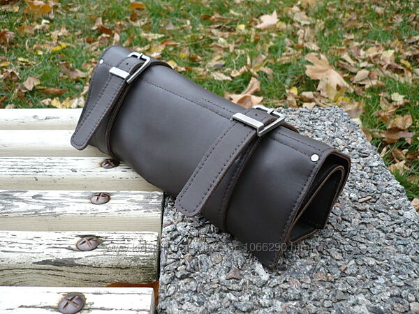 Сумка-скрутка для инструментов или поварских ножей. Кожа КРС краст с матовой лицевой поверхностью, цвет коричневый-шоколад. Финишное покрытие крем kenda farben grease mat ( Италия ). Сумка прошита вощеной нитью. Размеры 44*30 см. Размеры карманов слева направо: 7 см, 6 см, 6 см, 6 см, 6 см * 13 см. Размер бокового кармана 30 см*10 см. Ручная работа. Ценность: 2000 грн.