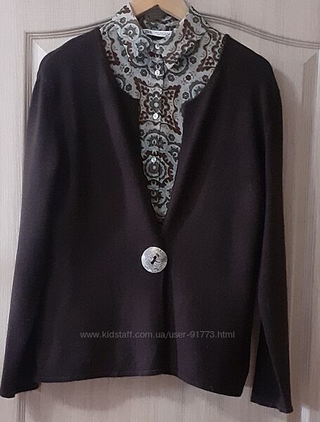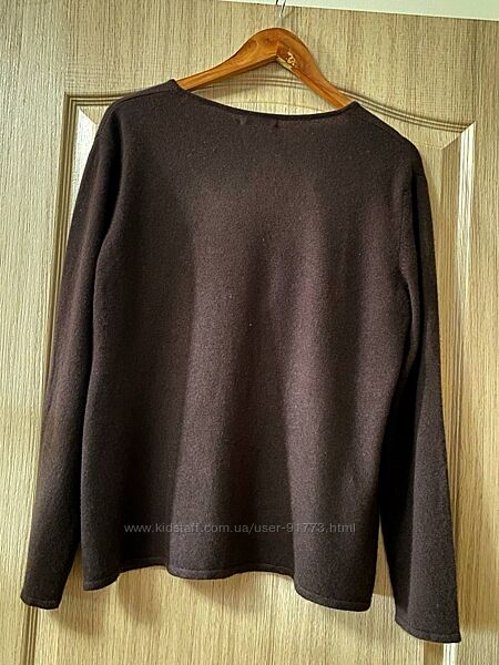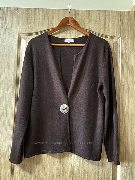 Кардиган Denockdesigns London/New York із 100% кашеміру, насиченого шоколадного кольору, розмір XL але більше підійде на М/L. Застібка - великий гудзик з перламутру. Без нюансів. Стан ідеальний.Заміри в нерозтягнутому вигляді: ширина плечей - 44 см, довжина рукава від лінії плеча - 60 см, півобхват грудей - 51 см, півобхват талії - 45 см, довжина - 61 см.