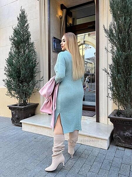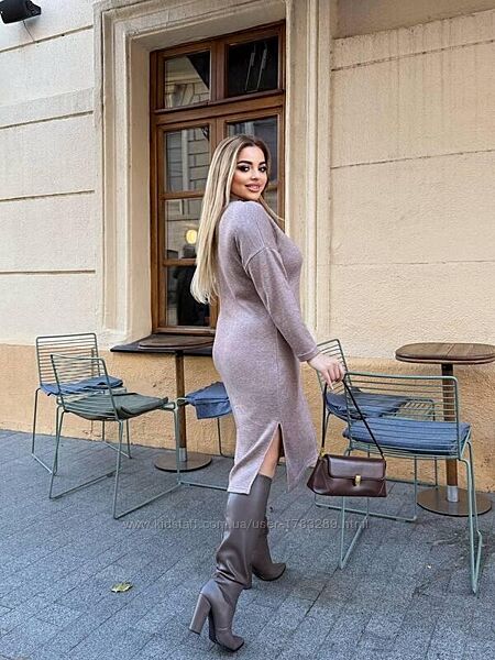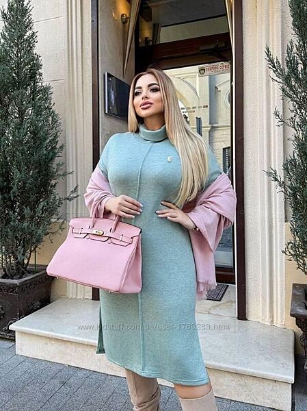 Сукня з довгим спущеним рукавом, ворот-стійка; плаття прикрашене декоративним швом по центру виробу, з боків розрізи.